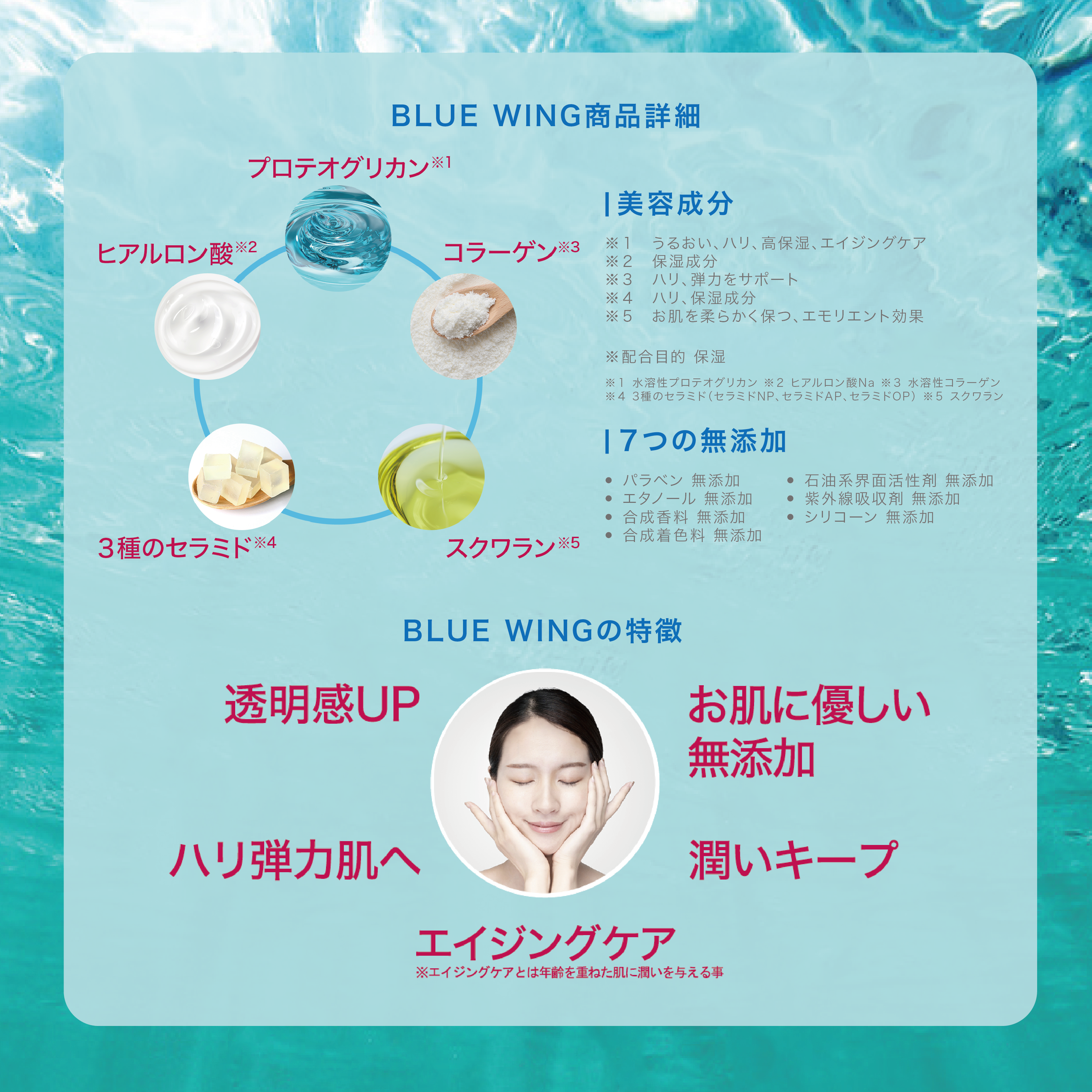 水溶性蛋白聚醣 、透明質酸鈉 、水溶性膠原蛋白、三種神經酰胺(Ceramide NP、Ceramide AP、Ceramide OP)、角鯊烷。