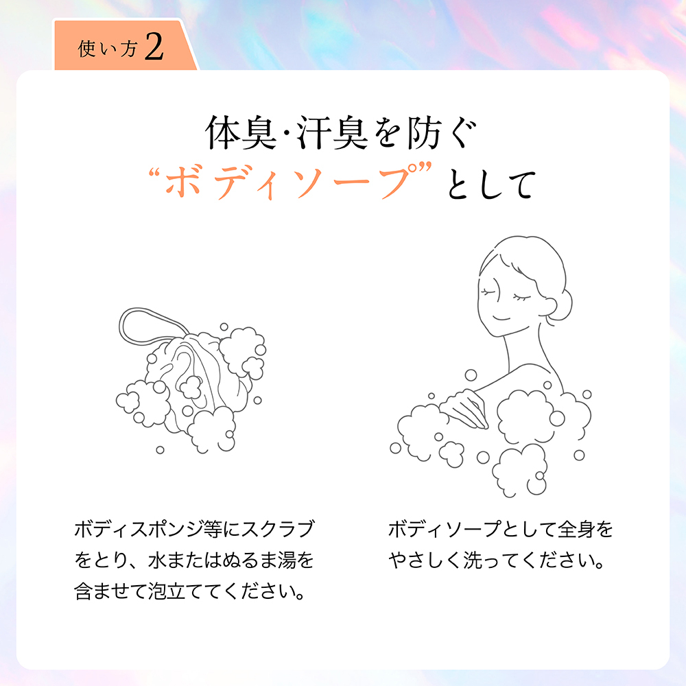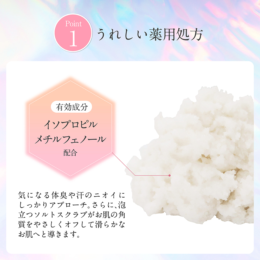 膏狀按摩柔滑劑,均衡地結合了小粒鹽磨砂膏和奶油狀泡沫清潔成分。輕輕塗抹泡沫,輕輕護理需要關注的部位。藥用配方可預防痤瘡、清潔和消毒皮膚以及消除體臭。您還可以通過起泡將其用作沐浴露和用於脆弱部位的肥皂。使用的鹽是國產的“赤穗鹽”。含有9種保濕成分(*),打造水潤肌膚。帶有華麗乾淨的白肥皂香味。