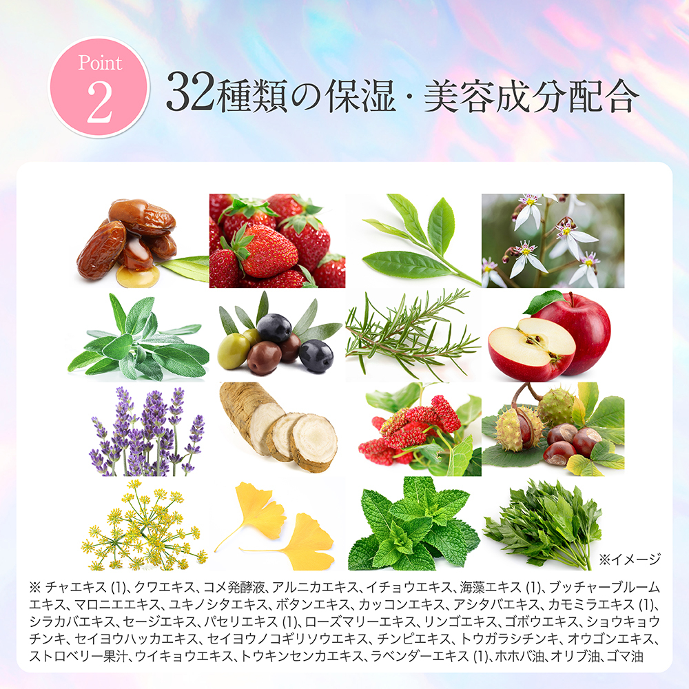 異丙基甲基苯酚、十四烯磺酸鈉溶液、茶提取物、桑葚提取物、大米發酵液、黃原膠、山金車提取物、銀杏葉提取物、海藻提取物、屠夫花提取物、七葉樹提取物、虎耳草提取物、鈕扣提取物、杜鵑提取物、1,3-丁二醇、純淨水、阿西塔巴提取物、洋甘菊提取物、樺木提取物、鼠尾草提取物、歐芹提取物、迷迭香提取物、蘋果提取物、牛蒡提取物、生薑酊劑、薄荷提取物、西洋蓍草提取物、黑猩猩提取物、辣椒酊劑、黃芩提取物、乾海水、草莓汁、茴香提取物、金盞花提取物、薰衣草提取物、荷荷巴油、橄欖油、芝麻油、香料、濃甘油、乙醇、無水乙醇