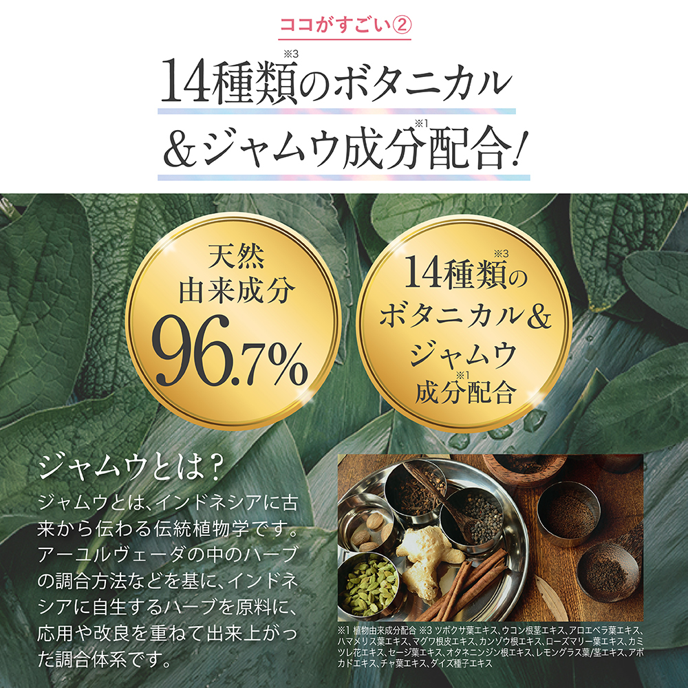 水、甘油、異戊二醇、檸檬酸、檸檬酸鈉、積雪草葉提取物、甘草酸二鉀、BG、薑黃根莖提取物、蘆薈葉提取物、金縷梅葉提取物、麥格納根皮提取物、甘草根提取物、迷迭香葉提取物、洋甘菊花提取物、鼠尾草葉提取物、人參根提取物、檸檬草葉/莖提取物、牛油果提取物、茶葉提取物、大豆籽提取物、乳酸菌/豆奶發酵液、PEG/PPG/聚丁二醇-8/5/3甘油、碘化丁基氨基甲酸丙炔酯、DPG、植物甾醇、o-cymen-5-ol、 PEG-60氫化蓖麻油、香料、乙基己基甘油、辛酸甘油酯、生育酚。