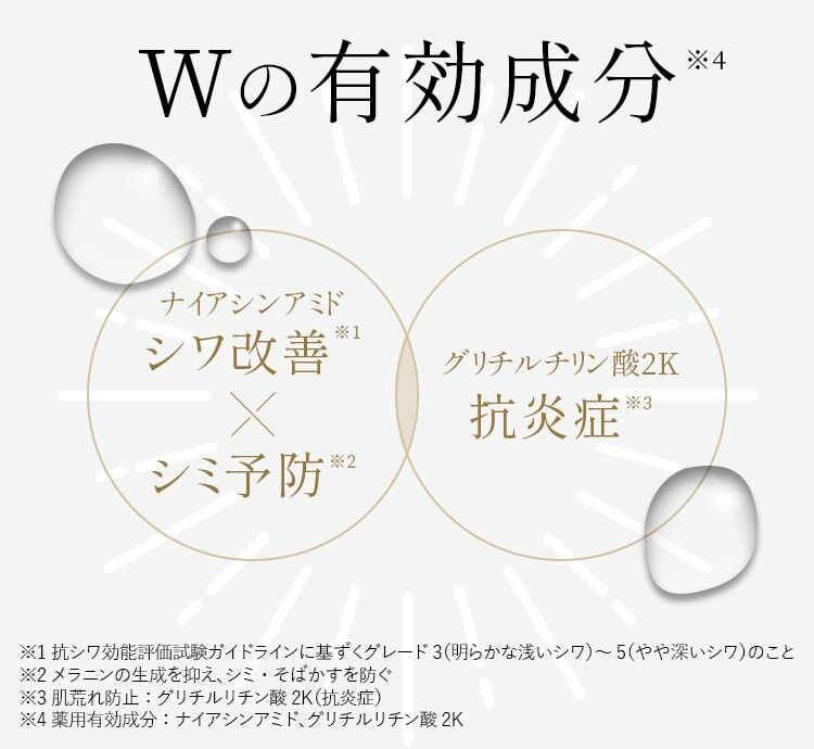 含有已被核准具有 「改善」和「預防」作用的藥用活性成分菸鹼醯胺、甘草酸二鉀,體驗有嚼勁、光澤和保濕的感覺,徹底改善皺紋。